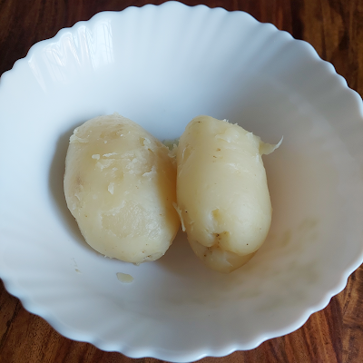 - Drain the potatoes, allow them to cool (about 10 to 15 mins) and peel the skin of the boiled potatoes.